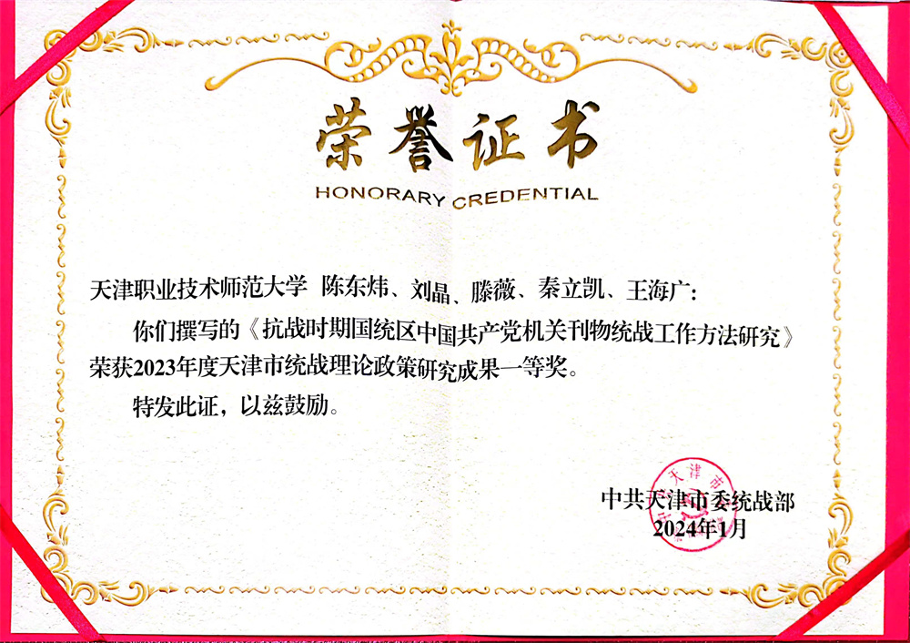 统区华夏同产党构造刊物统战任务办法研讨》获天津市统战表面计谋研讨效果1等奖。该文以齐里抗战时代《集体》周刊对于战时经济的剖释为切进面,阐明刊文的期间配景、面对题目战处理计划等,总结其正在稳固战夸大抗日平易近族合并阵线进程中所采纳的任务办法,尽力归纳乐成履历,以史为鉴、察去知去,不息坚决汗青自大、加强汗青自动,帮力正在新征途上持续干美统战任务,为齐里促进中华平易近族巨大中兴奉献气力。